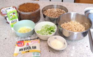 1.ソイフレークを10分ほど水につけて戻して、水を切っておく